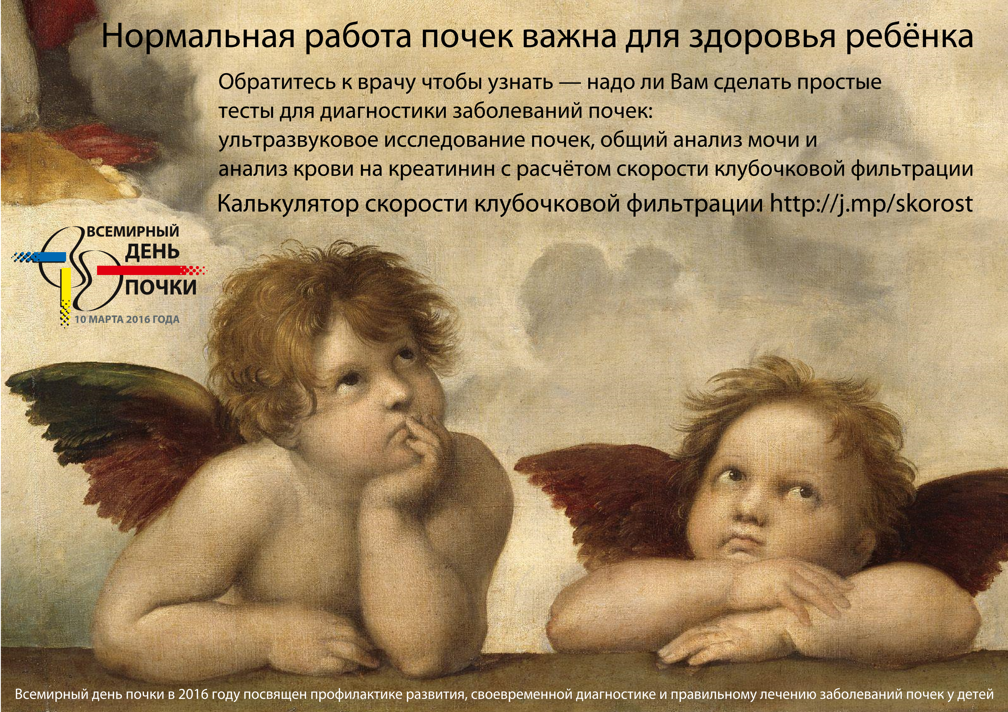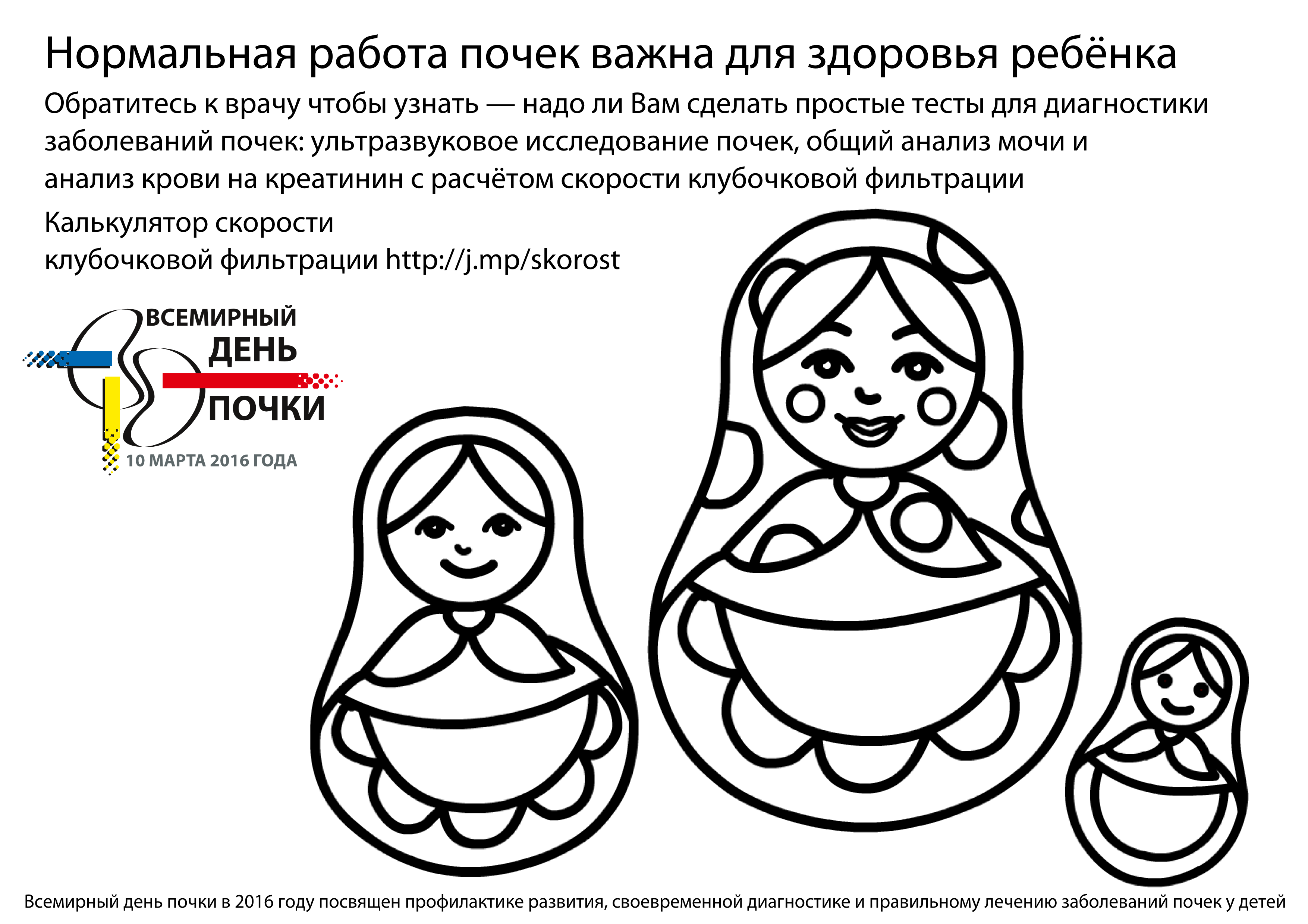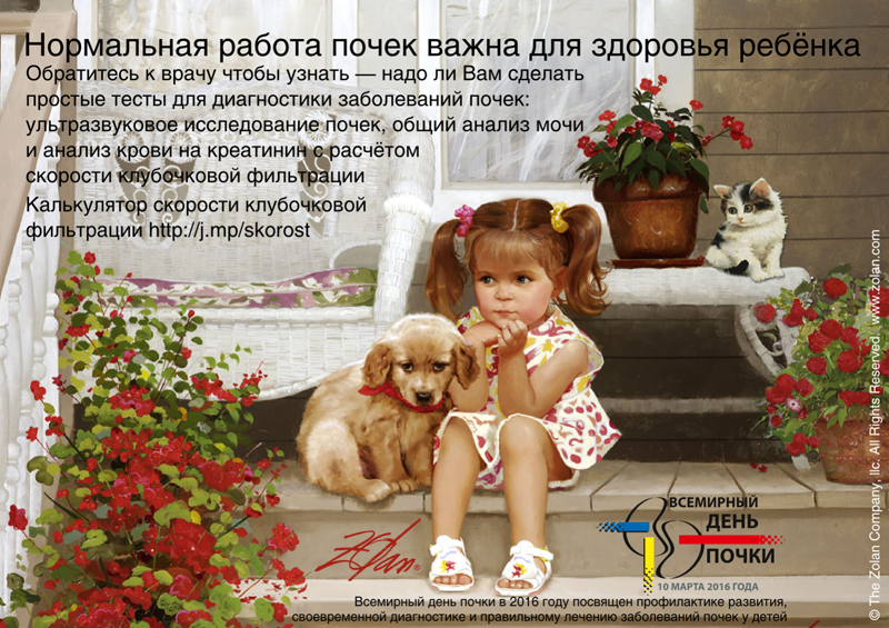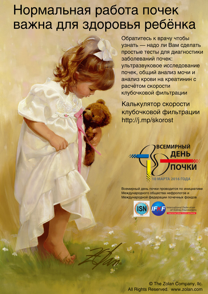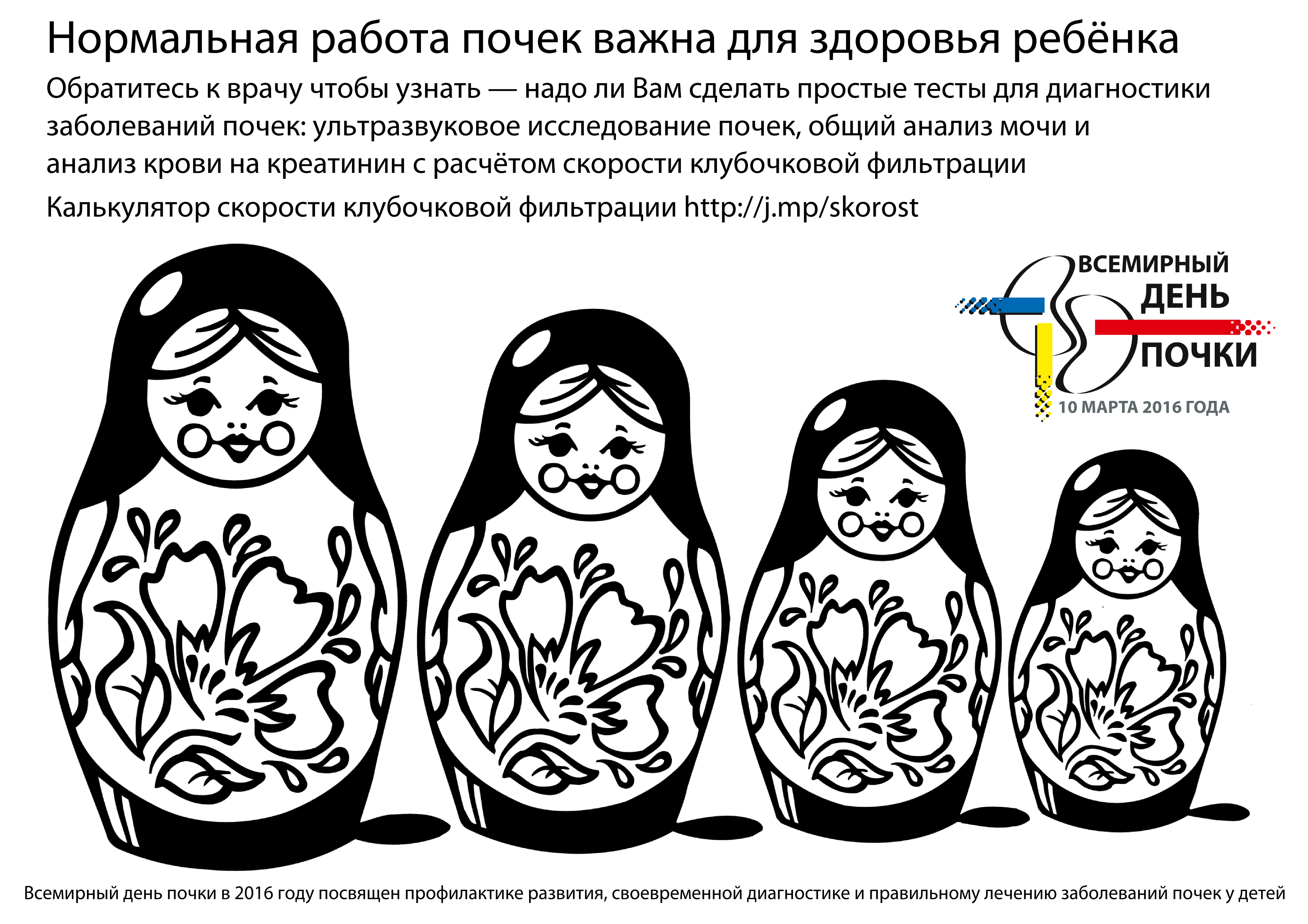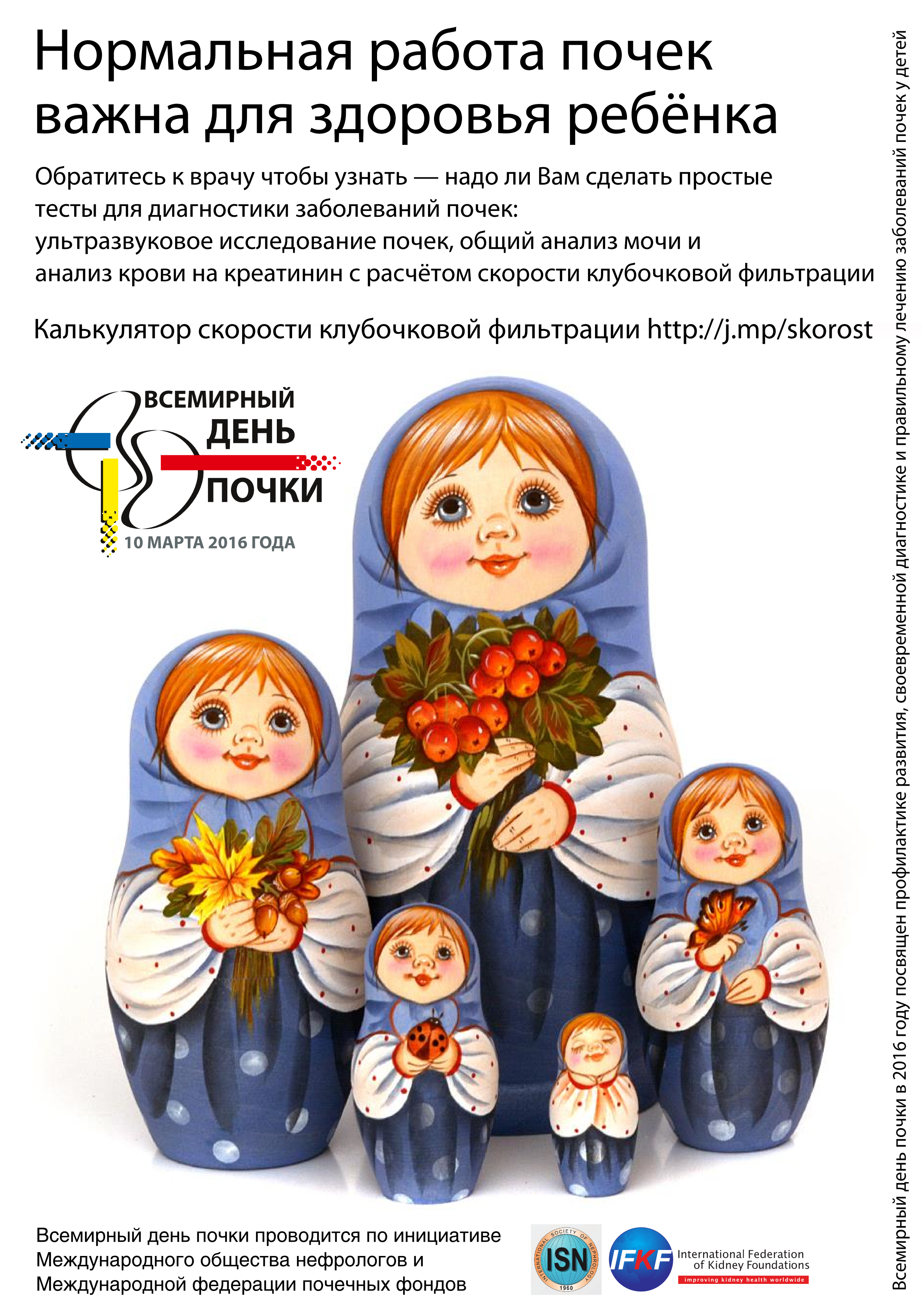 В 2016 году Всемирный день почки посвящен профилактике развития, своевременной диагностике и правильному лечению заболеваний почек у детей. Эта тема особенно актуальна с учетом создания предпосылок в раннем детском возрасте к развитию почечной патологии, которая затем проявляется у взрослых. Такие предпосылки включают и малое число нефронов при рождении, и аномалии развития почек и мочевыводящих путей, и хроническую болезнь почек в детском возрасте – поэтому основным девизом Дня почки-2016 стала ранняя профилактика развития заболеваний почек.
